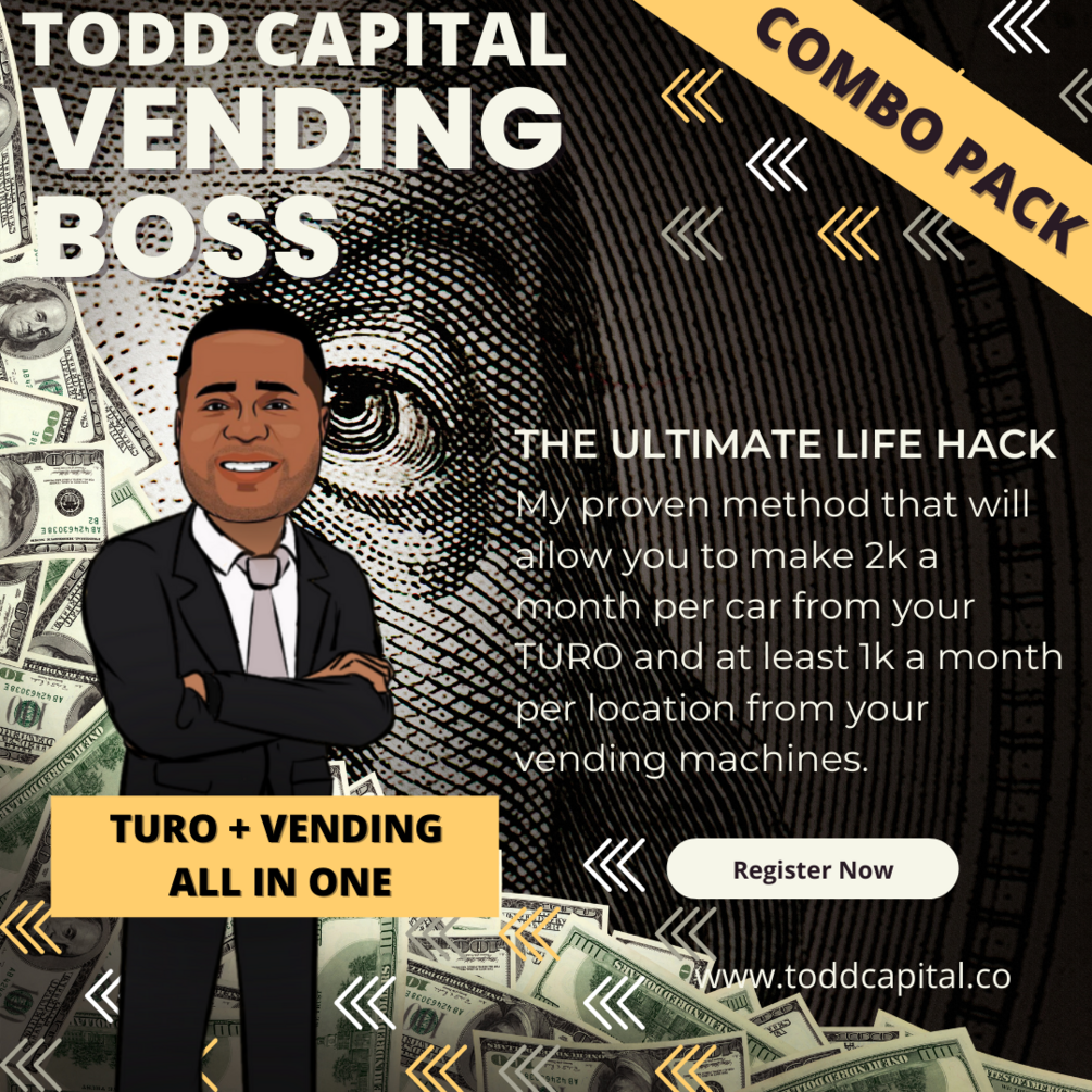 What you will get: My proven method that will allow you to make 2k a month from your TURO and at least 2k a month from your vending machines.